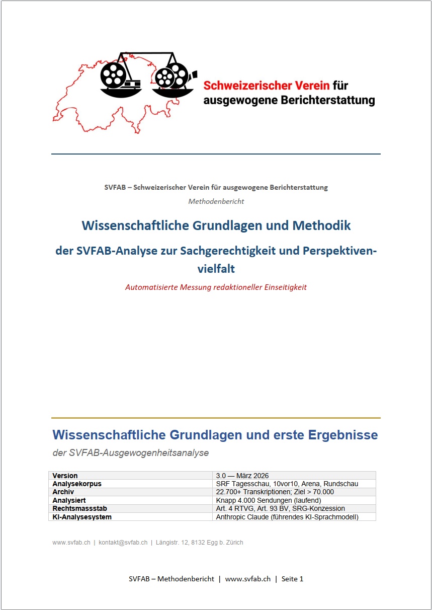 Der SVFAB (Schweizerischer Verein für ausgewogene Berichterstattung) hat ein vollautomatisches Analysesystem entwickelt, das diese Frage erstmals datenbasiert und skalierbar beantwortet — über Tausende von Sendungen hinweg, nicht anhand von Einzelfällen.